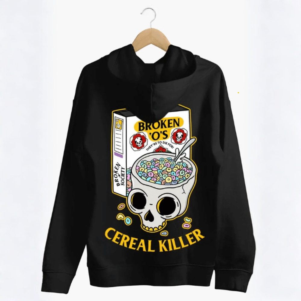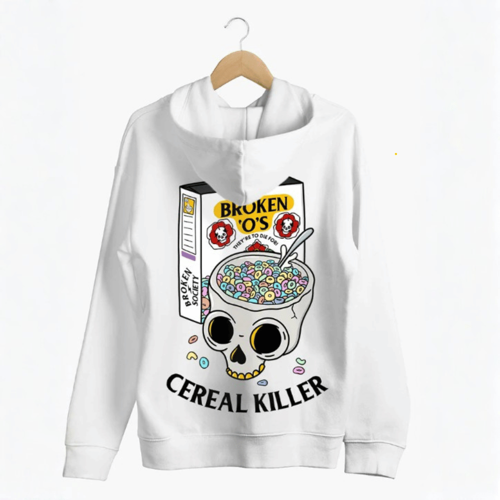 A bold and expressive hoodie from Broken Society featuring the “Cereal Killer” design, perfect for everyday wear or gifting with a bit of edge. Available in black or white, with matching designs across other items.