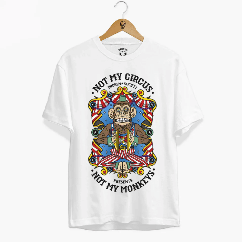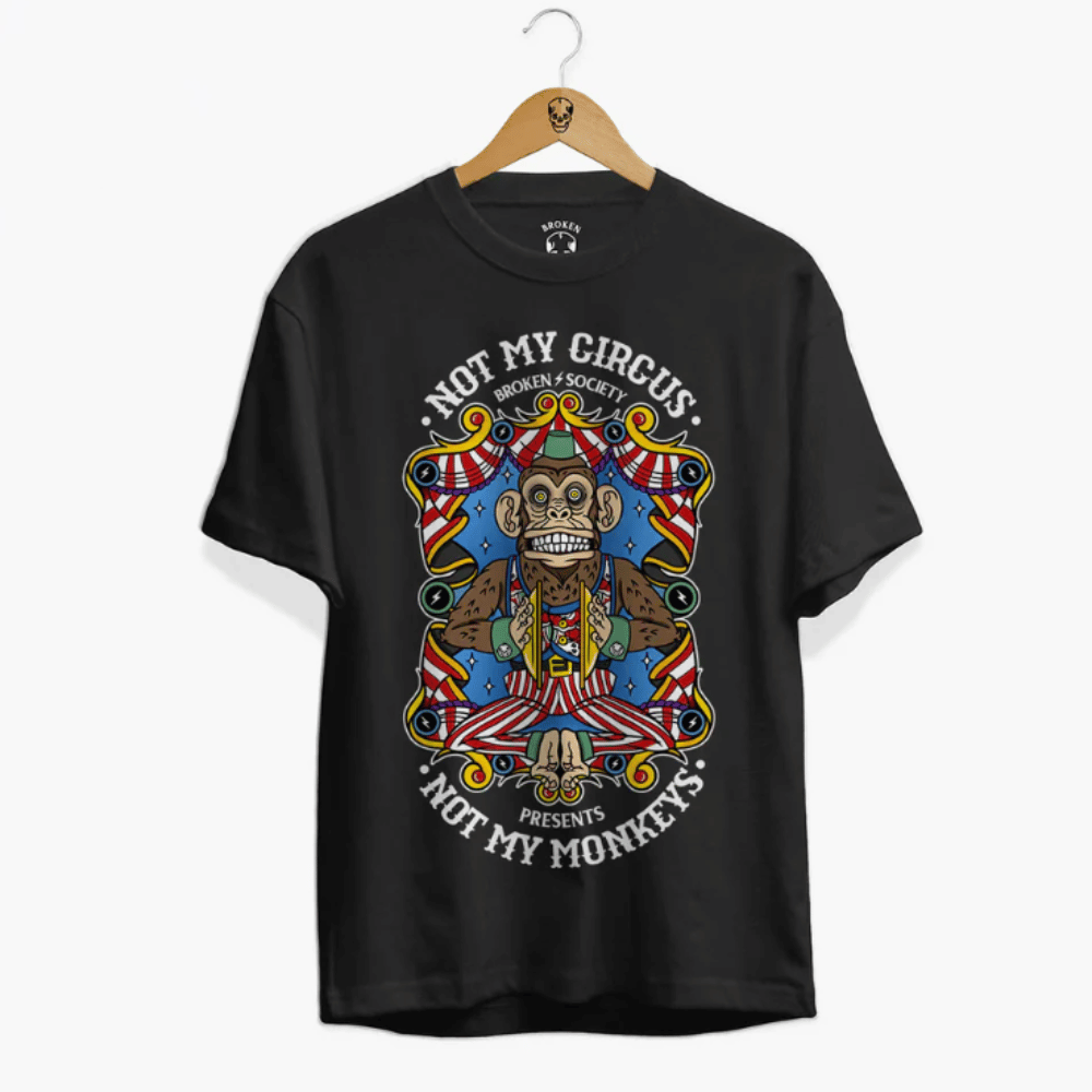 The Not My Circus Front Print T-Shirt from Broken Society is a bold statement tee featuring the iconic phrase that perfectly sums up those chaotic moments in life. Available in black or white, other garment styles and mugs. it’s a fun and expressive piece for anyone who appreciates humour with attitude.